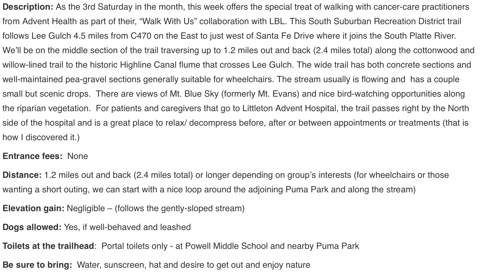 If you’re starting a new walk, seek out a 2-3 mile flat route without a lot of hazards such as stairs, tree roots, and rocks. We use the High Line Canal in Denver, a wide, dirt trail with flat sections in the neighborhoods of our hospitals. Ideally, it will be easy to park with a safe path from the parking lot to the starting point. Others can and do host walks in urban environments as well.